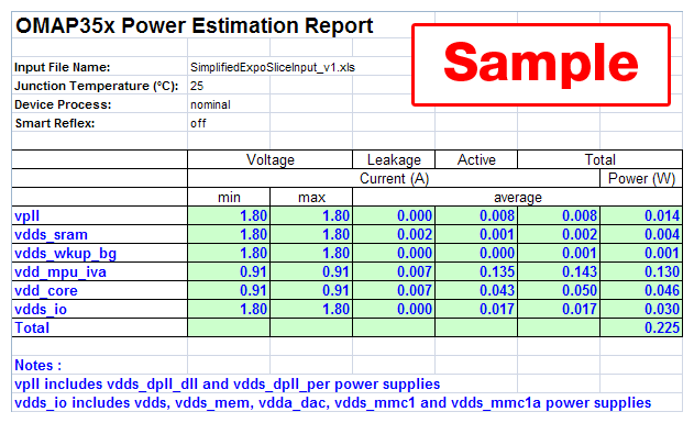 3. Power estimation report - This report is emailed to you and contains the information on power consumption based on the spreadsheet that you previously uploaded. The report includes information on leakage, active and total average power, as well as power management voltages, if Smart Reflex is utilized.